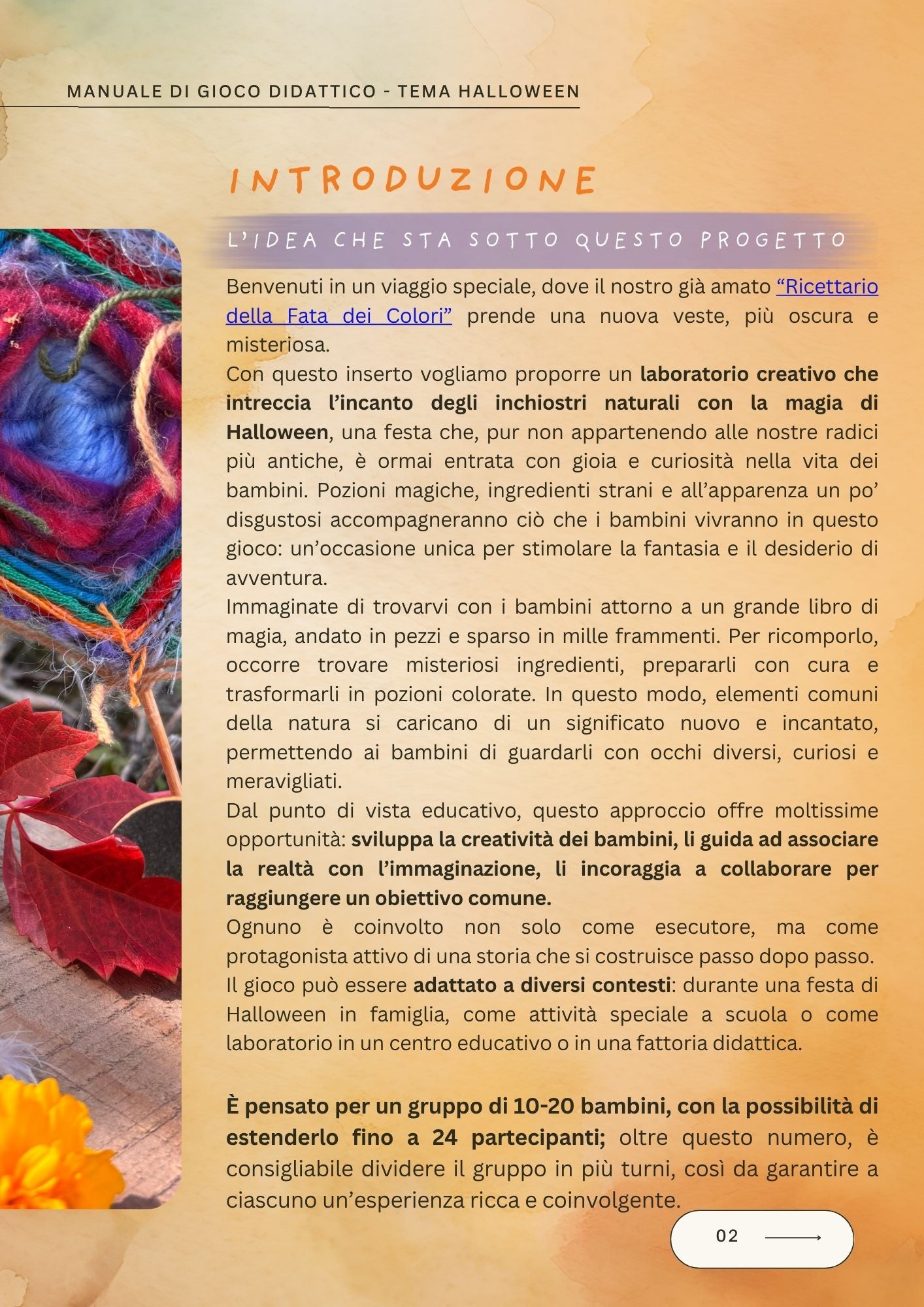 Il Libro delle Pozioni Perdute è un manuale–gioco (E-BOOK) educativo e magico, pensato per insegnanti, genitori ed educatori che vogliono vivere con i bambini un’esperienza di Halloween diversa: creativa, naturale e ricca di mistero.